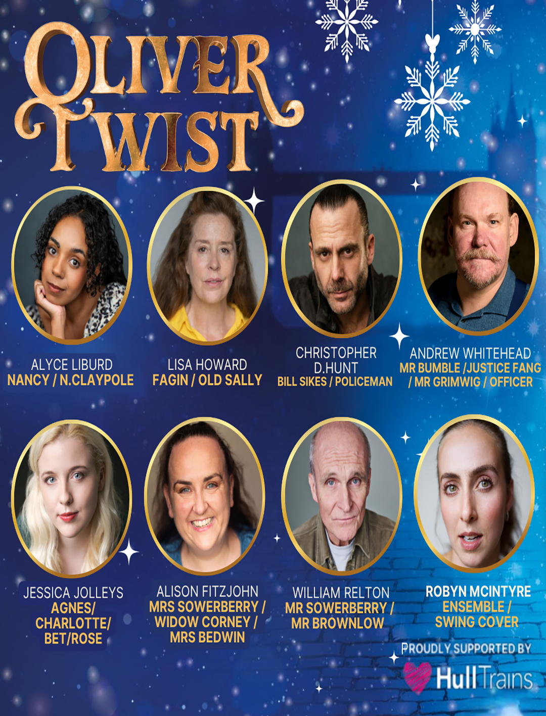 A 19-strong young company of performers cast from Hull Truck's Youth Theatre and other local performing arts groups will support the professional cast. Sophia Pike and Vivienne Rowland will share the role of Oliver Twist, and Eve McDonald and Zach Robinson will share the role of Dodger.